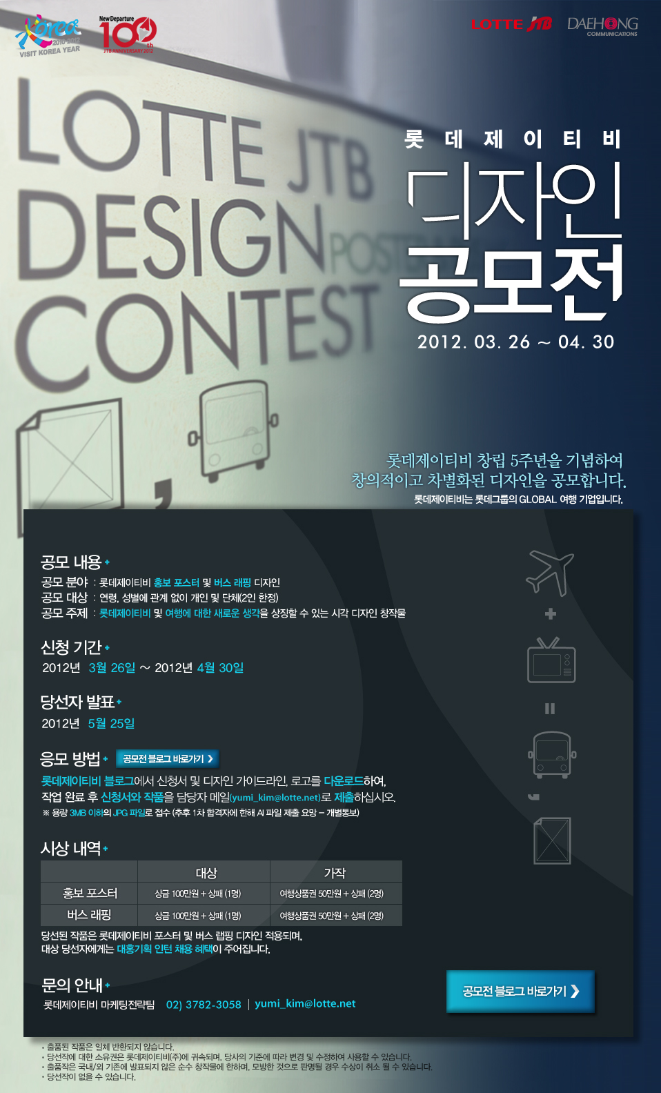 ★대홍기획과 함께하는 롯데제이티비 2012 명품 디자인 공모전★ 제 1 회 롯데제이티비 디자인 공모전  롯데그룹의 글로벌 여행기업 롯데제이티비! 롯데제이티비는 풍부한 인프라를 가진 국내 유통그룹 롯데와 세계적 여행기업인 JTB가 만나 설립된 여행사입니다! 새로운 아이디어가 넘치시는 분! 창의적인 발상으로 주체를 못하시는 분! 나의 생각을 펼쳐보이고 싶으신 분! 나만의 차별화된  느낌이 있으신 분! 대홍기획과 함께하는 롯데제이티비 디자인공모전에 신청해 주세요 ^^ 그동안 쌓아왔던 아이디어를 펼칠 수 있는 멋진 기회! 대상 시상자에게는 대홍기획의 인턴채용의 기회까지! ● 목적 롯데제이티비 창립 5주년을 맞이하여, 롯데제이티비 및 "여행에 대한 새로운 생각"을 상징할 수 있는 차별화되고 창의적인 디자인 공모 ● 개요 ○ 제목 : 대홍기획과 함께하는 롯데제이티비 디자인 공모전 ○ 대상 : 연령, 성별 관계없이 개인 및 단체 (2인 한정) ○ 기간 : 2012.3.26 ~ 2012.4.30 (최종 당선 발표 : 5월 25일(롯데제이티비 창립기념일)) ※1차 당선자 개별 통보 예정 ● 지원분야 ○ 롯데제이티비 및 여행에 대한 새로운 생각을 상징할 수 있는 시각 디자인 창작물 ● 제출서류 ○ 참가지원서 (롯데제이티비 양식) ○ 창작물 (JPG 형식의 파일) ● 접수방법 ○ 블로그 첨부파일에서 신청서 다운로드 후 작품과 함께 yumi_kim@lotte.net으로 제출 ● 혜택 ○ 포스터 및 버스랩핑 대상 분야별 각 1명 대상 상금 100만원 / 가작 분야별 각 2명 가작 롯데제이티비 여행상품권 50만원권 ○ 대상 당선자 대홍기획 인턴 채용 혜택 ★ 그 외 자세한 설명은 첨부파일의 공모전 모집 요강을 참조해 주세요★ 멋진 아이디어와 감각을 지닌 여러분의 많은 참여 기다리겠습니다 :)