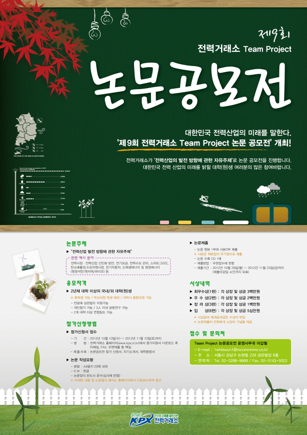 ‘제9회 전력거래소 Team Project 논문공모전’을 시행합니다. 이에 아래와 같이 공고하오니,