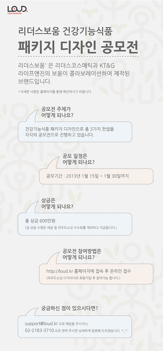 ▶ 주제 - 건강기능식품 패키지 디자인으로 총 3가지 컨셉을 각각의 공모전으로 진행▶ 일정- 2013.01.15~2013.01.30▶ 상금- 총 상금 600만원(실 상금 수령은 세금 및 라우드소싱 수수료를 제외하고 지급)▶ 참여방법- http://loud.kr 홈페이지에 접속 후 온라인 접수(라우드소싱 디자이너로 회원가입 후 참여가능)▶ 문의사항- support@loud.kr / 02-2183-3710