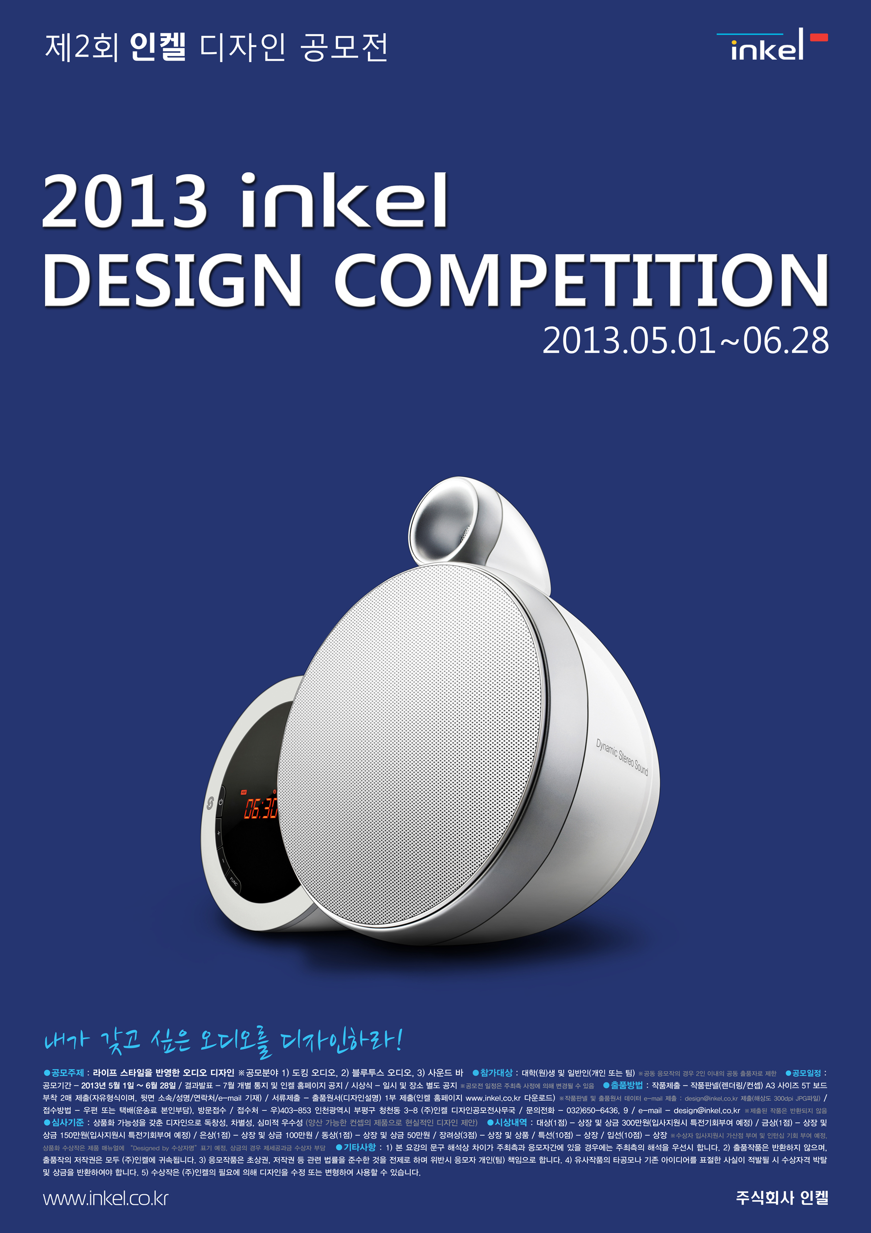 - 서류제출 : 출품원서 (디자인 설명) 1부 제출 (인켈 홈페이지 www.inkel.co.kr 다운로드)