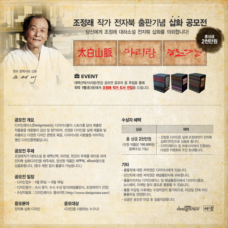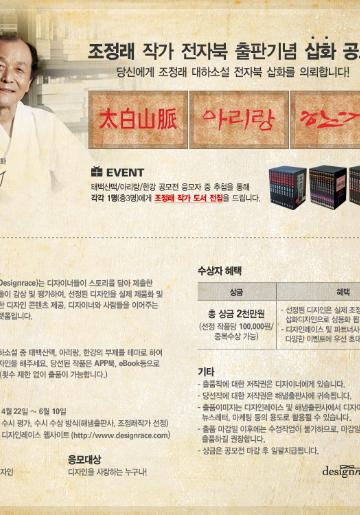 - 조정래 작가 대하소설 중 태백산맥, 아리랑, 한강의 부제를 테마로 하여 전자북 삽화디자인을 해주세요. 당선된 작품은 APP북, eBOOK등으로 상용화됩니다. (횟수 제한 없이 출품이 가능합니다)