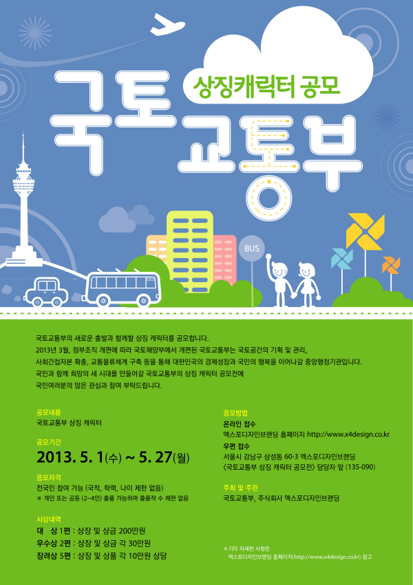 - 접수처 : (135-090) 서울시 서울시 강남구 삼성동 60-3 엑스포디자인브랜딩 국토교통부 상징 캐릭터 공모전 담당자 앞