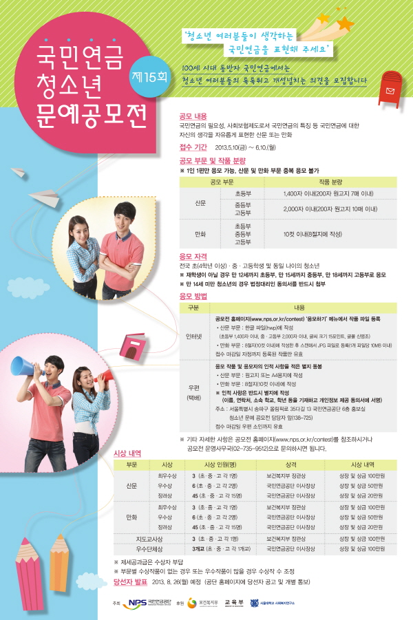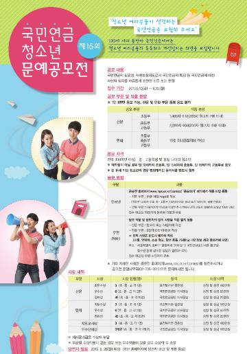 - 주소 : 서울특별시 송파구 올림픽로 35다길 13 국민연금공단 6층 홍보실 청소년 문예 공모전 담당자 앞(138-725)