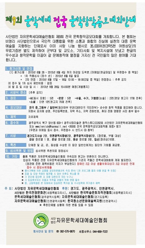 - 사단법인 자유문학세대예술인협회(062-576-9870) 세종시(044 868-7022)