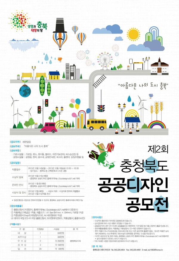☞ 보내실 곳 : 360-765 충청북도 청주시 상당로 82 (문화동 82번지) 충북도청 건축문화과(서관 3층) ‘2013 제2회 충청북도 공공디자인 공모전’ 담당자 앞