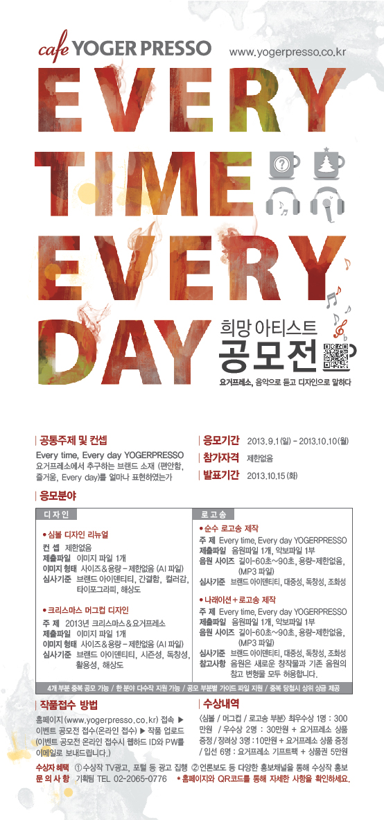멀티디저트카페전문점 요거프레소에서 젊은 감성의 신규 심볼 디자인/크리스마스 머그컵 디자인/ 순수 로고송 제작/ 나래이션+로고송 제작 등 총 4개부분을 공모합니다. 여러분의 목소리와 디자인을 요거프레소에 보여주세요.