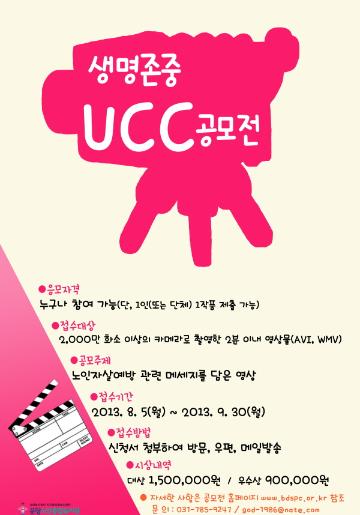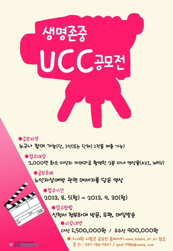 분당노인자살예방센터에서는 지역사회 내 노인자살에 대한 인식개선 및 노인자살고위험군 발굴을 유도하기 위한 ' 생명존중 UCC' 공모전을 아래와 같이 개최하오니 많은 분들의 적극적인 참여 부탁드립니다.