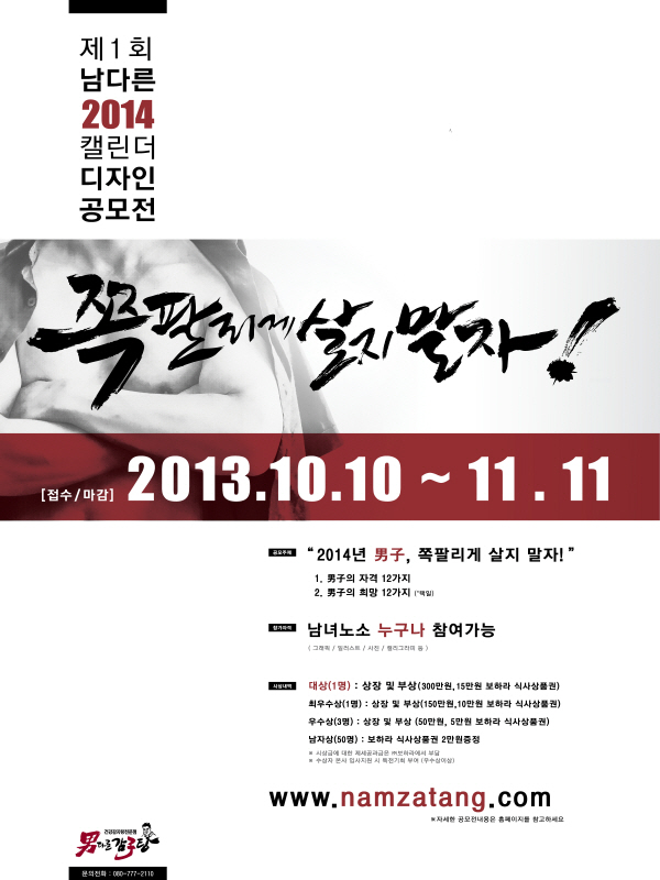 ' 남다른감자탕' 은 대한민국 남자들을 위해 탄생한 건강감자탕 브랜드로, 브랜드 런칭 3주년 기념하여, 남다른 달력공모전을 개최합니다. 남다른감자탕만이 가지고 있는 장점을 잘살려 일러스트, 캘리그라피 등 자유롭게 표현해주세요.