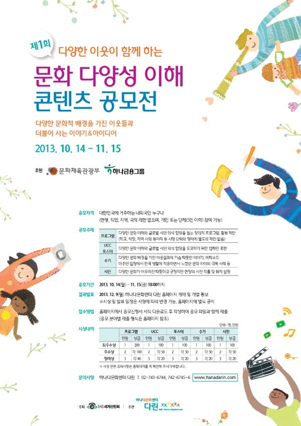 - 다문화 다양성 이해 콘텐츠 공모전 “다양한 문화적 배경을 가진 이웃들과 더불어 사는 이야기& 아이디어”
