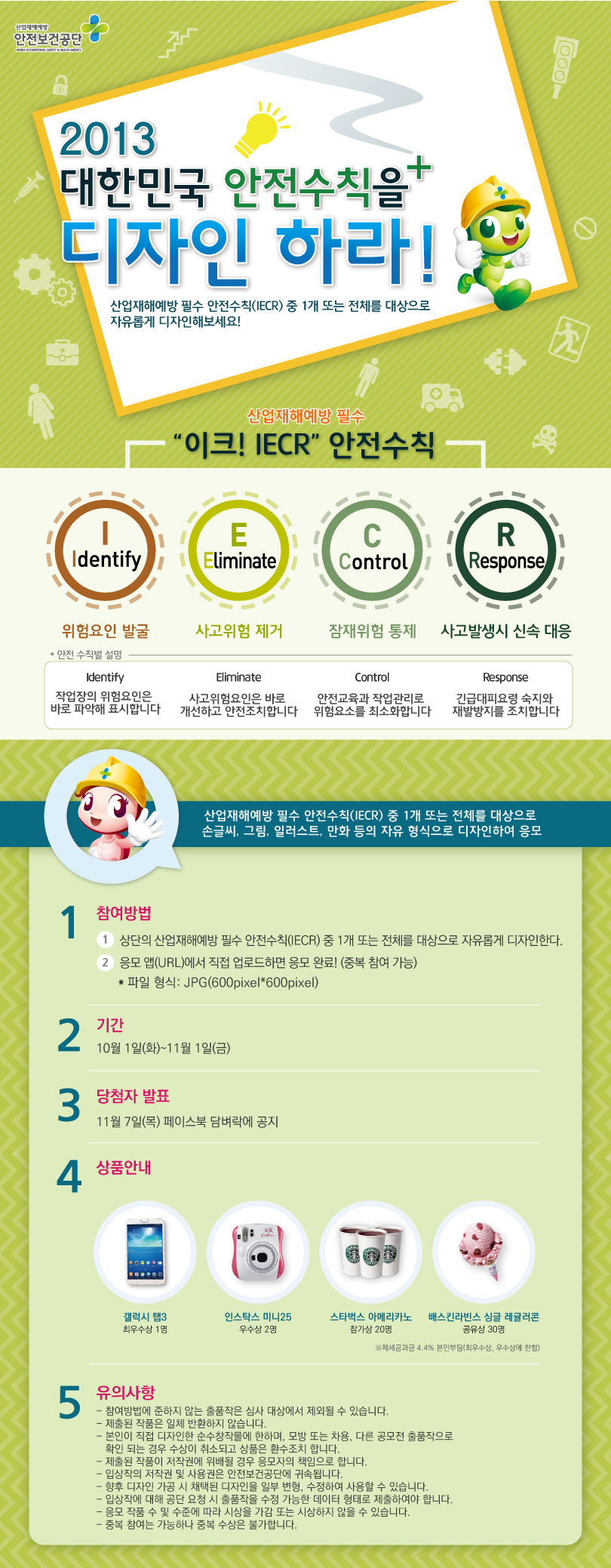 - 산업재해예방 필수 안전수칙(IECR) 중 1개 또는 전체를 대상으로 자유롭게 디자인해보세요!