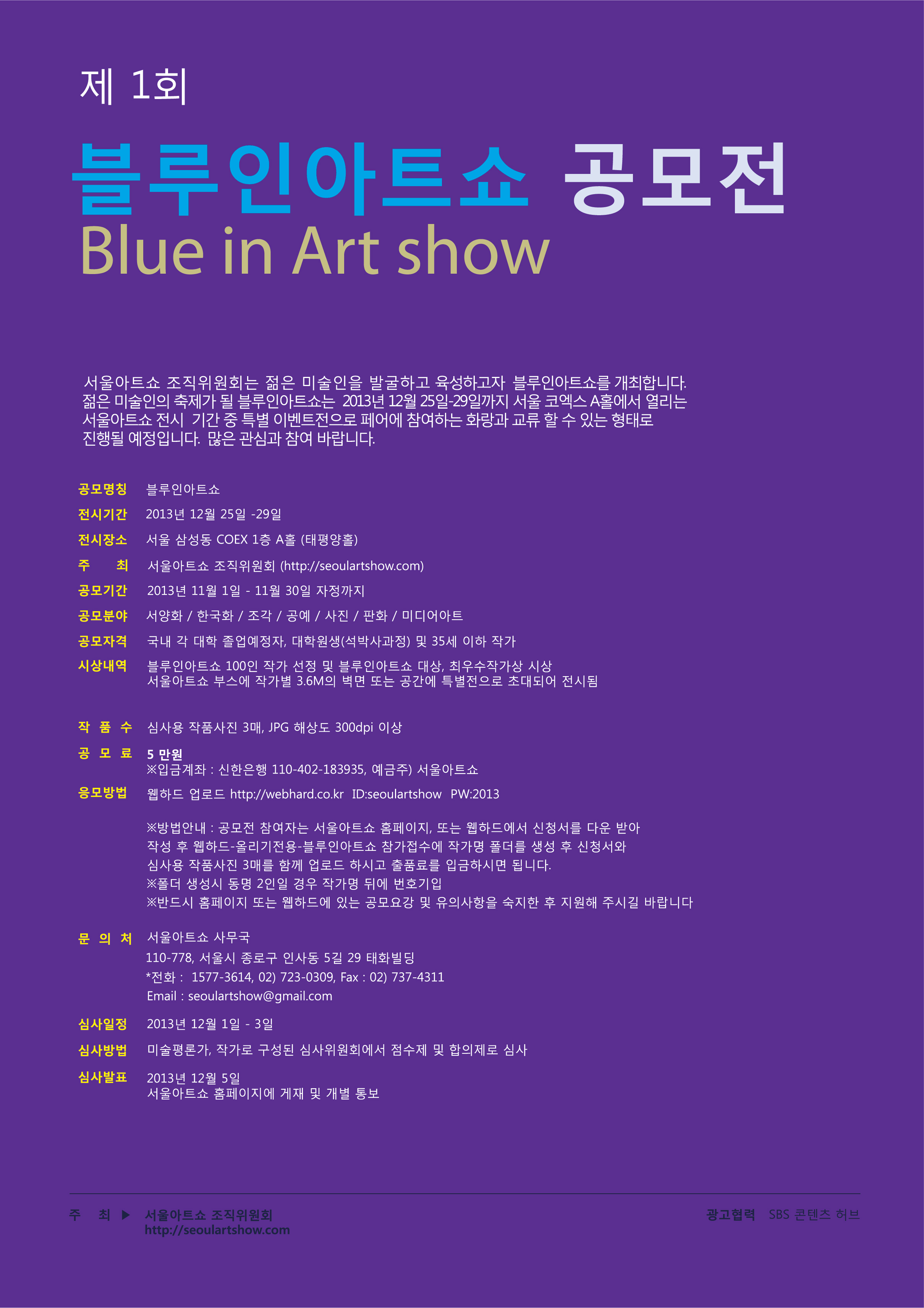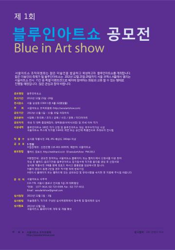 서울아트쇼 조직위원회는 젊은 미술인을 발굴하고 육성하고자 블루인아트쇼를 개최합니다.젊은 미술인의 축제가 될 블루인아트쇼는 2013년 25일-29일까지 서울 코엑스 A홀에서 열리는 서울아트쇼 전시 기간 중 특별 이벤트전으로 페어에 참여하는 화랑과 교류 할 수 있는 형태로 진행될 예정입니다. 많은 관심과 참여 바랍니다.
