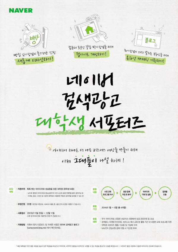 - 서류접수 : 2013년 11월 25일 ~ 12월 11일 (서류 합격자에 한해 개별면접 진행 후 선발합니다.)