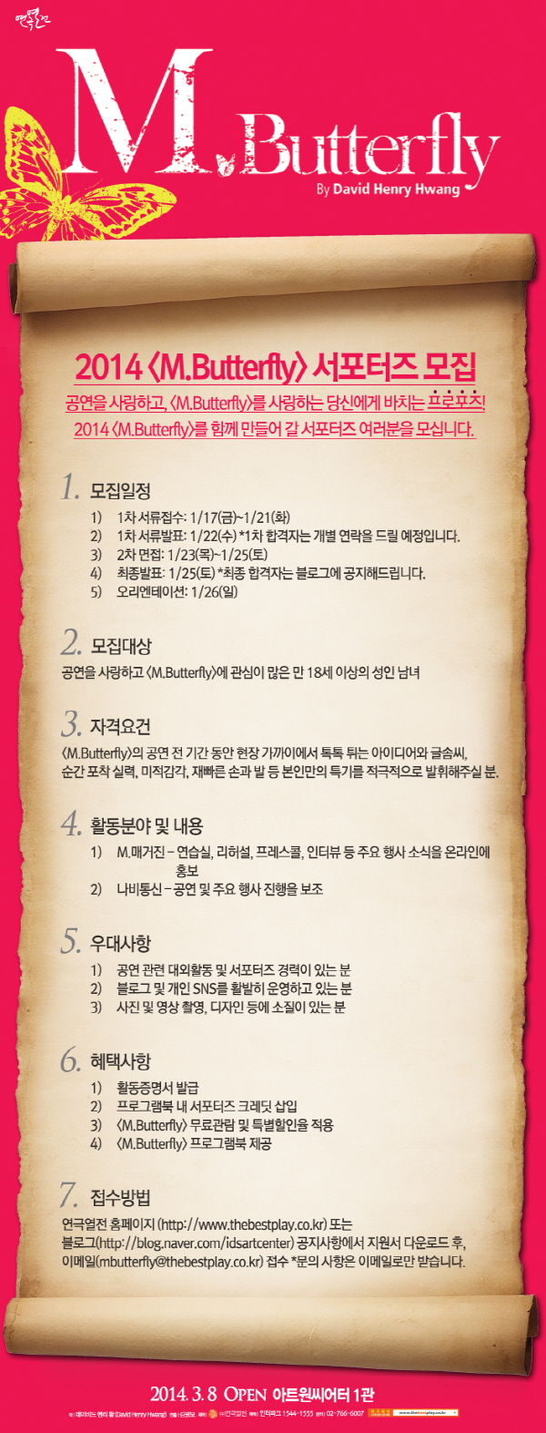- 공연을 사랑하고 M.Butterfly에 관심이 많은 18세 이상의 성인 남녀