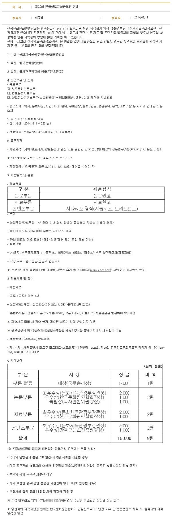 올해 「제29회 전국향토문화공모전을」을 아래와 같이 개최하오니