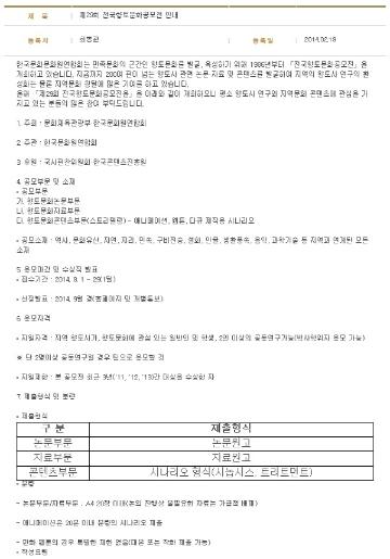 - 향토문화콘텐츠부문(스토리텔링) : 애니메이션, 웹툰, 다큐 제작용 시나리오