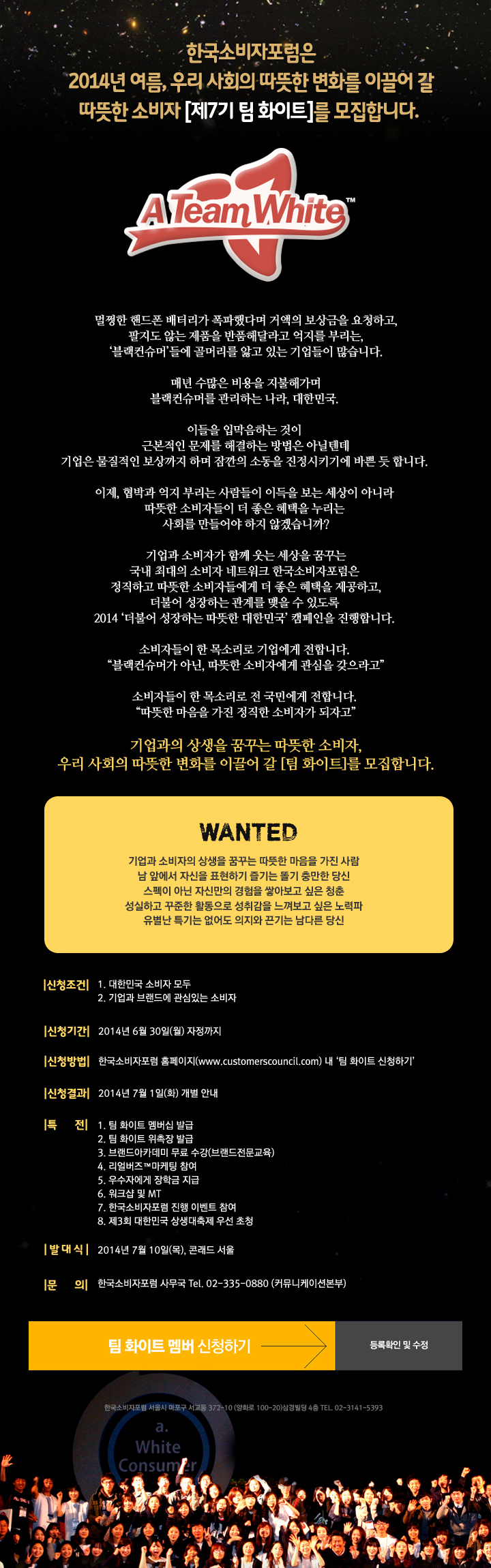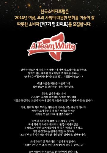 2014 ‘더불어 성장하는 따뜻한 대한민국’ 캠페인을 진행합니다. 소비자들이 한 목소리로 기업에게 전합니다. “블랙컨슈머가 아닌, 따뜻한 소비자에게 관심을 갖으라고” 소비자들이 한 목소리로 전 국민에게 전합니다. “따뜻한 마음을 가진 정직한 소비자가 되자고” 기업과의 상생을 꿈꾸는 따뜻한 소비자, 우리 사회의 따뜻한 변화를 이끌어 갈 [팀 화이트]를 모집합니다.