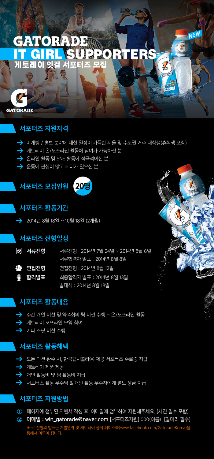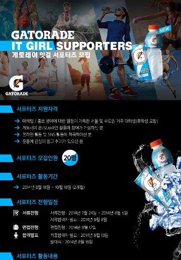 - 글로벌 NO.1 브랜드 게토레이와 온오프라인 활동을 함께할 잇걸 서포터즈를 모집합니다!