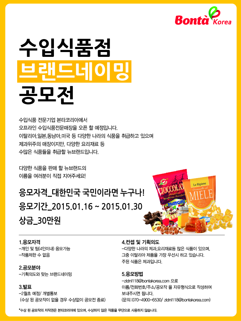 - zldnl118@bontakorea.com 으로 이름/전화번호/주소/공모작을