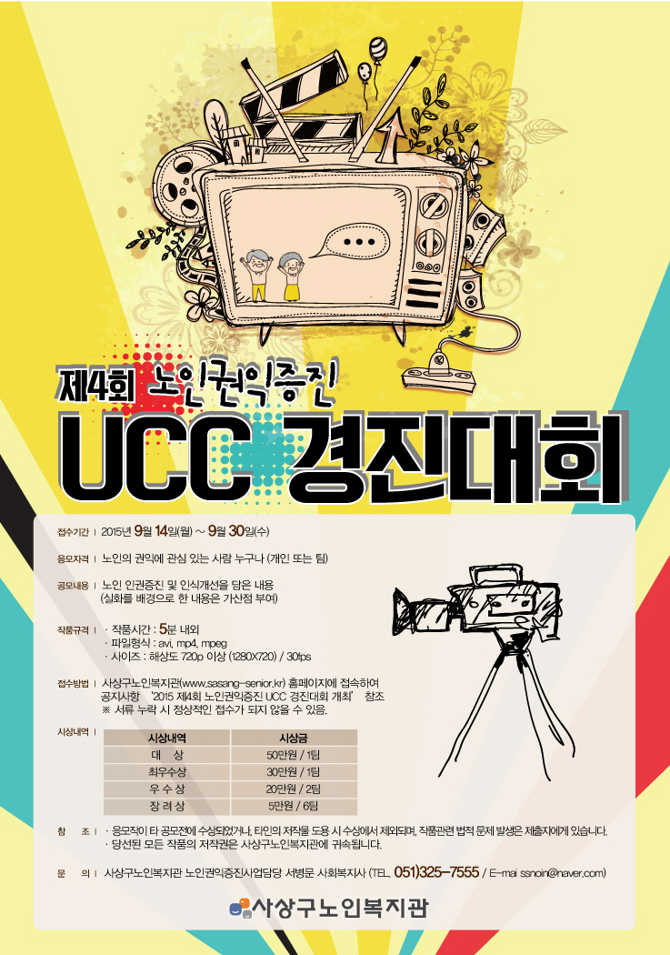 - 사상구노인복지관(www.sasang-senior.kr) 홈페이지에 접숙하여 공지사항 ' 2015 제4회 노인권익증진 UCC 경진대회 개최' 의 ' 2015 참가신청서' 를 다운로드 및 작성하여 본인의 작품과 함께 이메일을 통해 접수 및 작품 제출(E-mail : ssnoin@naver.com)