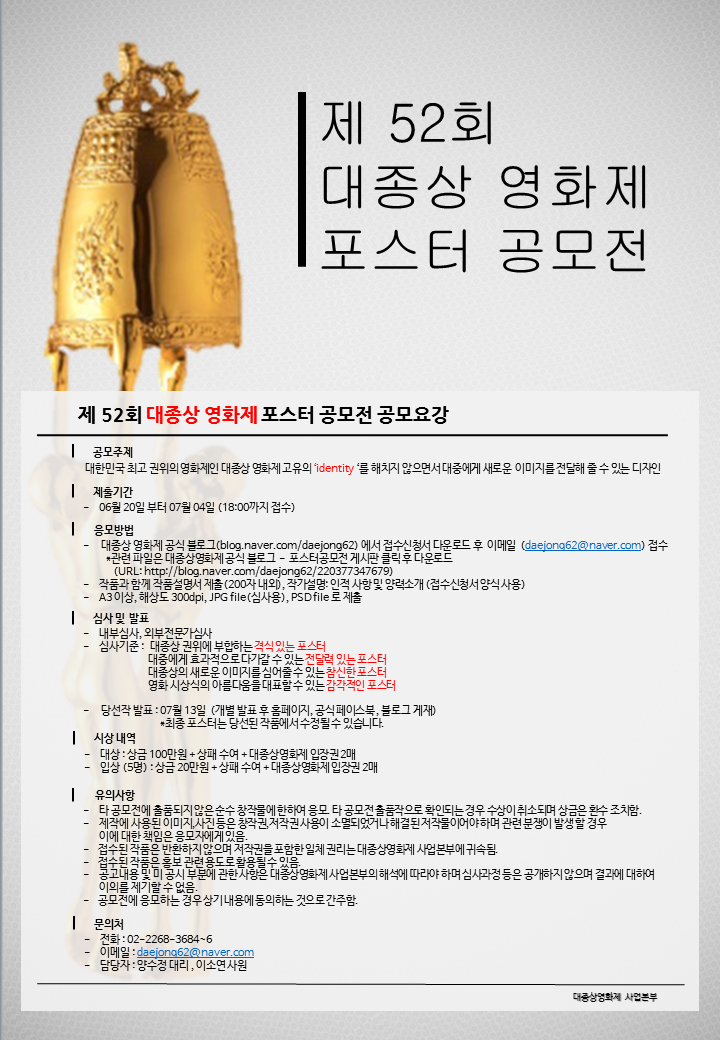 - 관련파일은 대종상영화제 공식 블로그 – 포스터 공모전 게시판 클릭 후 다운로드(URL:http://blog.naver.com/daejong62/220377347679)