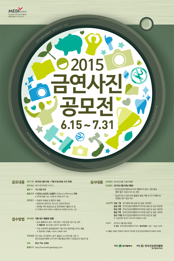 한국건강관리협회 대구지부에서는 시민들의 흡연문화에 대한 인식전환과 금연에 대한 관심 및 사회적 분위기를 확산하여 국민건강증진에 기여하고자 2015년 금연사진 공모전을 실시합니다.