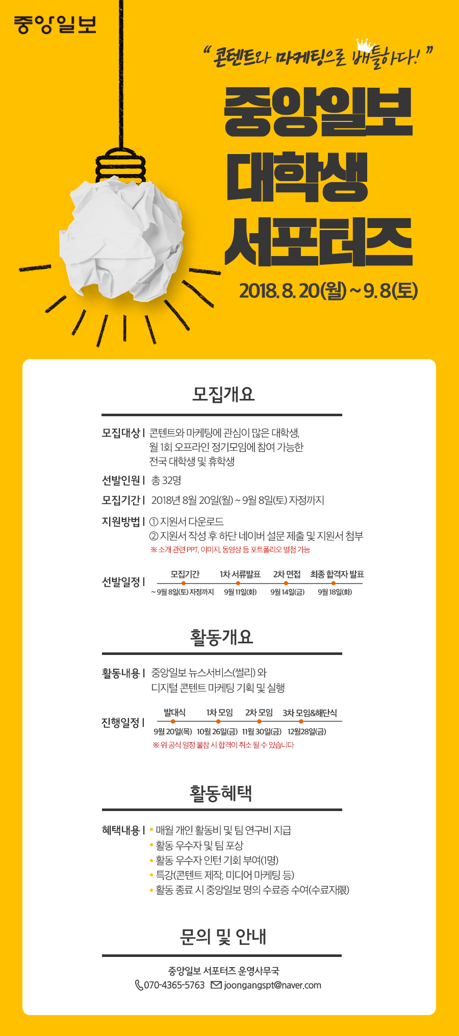 - 모집기간 : 2018년 8월 20일(월) ~ 9월 8일(토) 자정까지