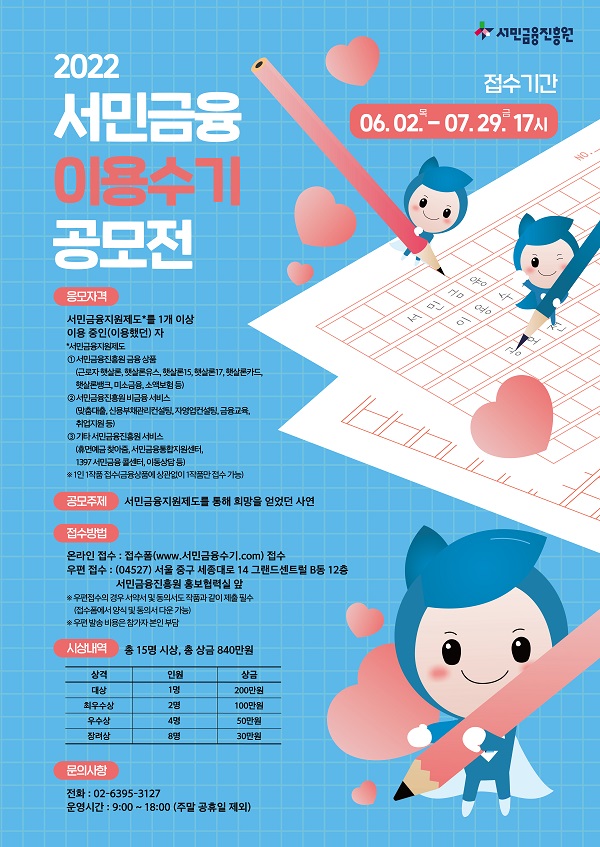 - 우편 접수 : (04527) 서울 중구 세종대로 14 그랜드센트럴 B동 12층 서민금융진흥원 홍보협력실 앞