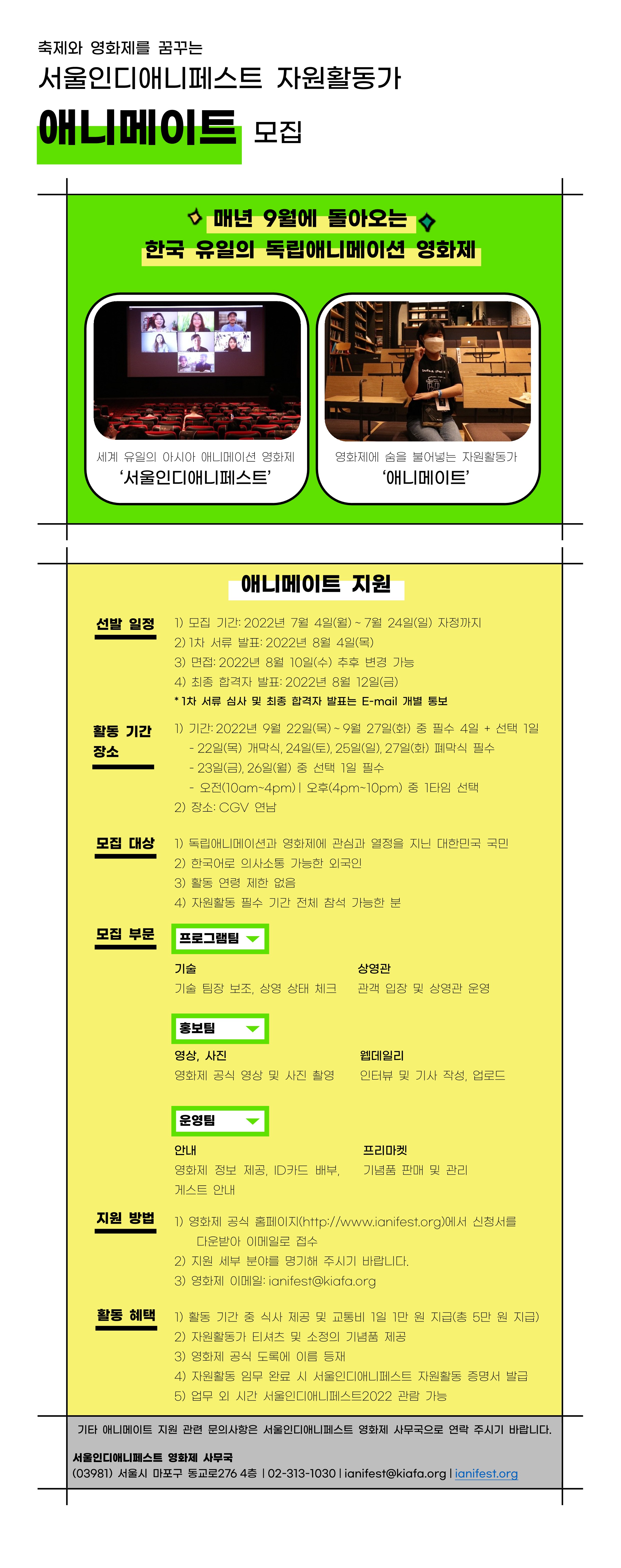 - 자원활동 임무 완료 시 서울인디애니페스트 자원활동 증명서 발급