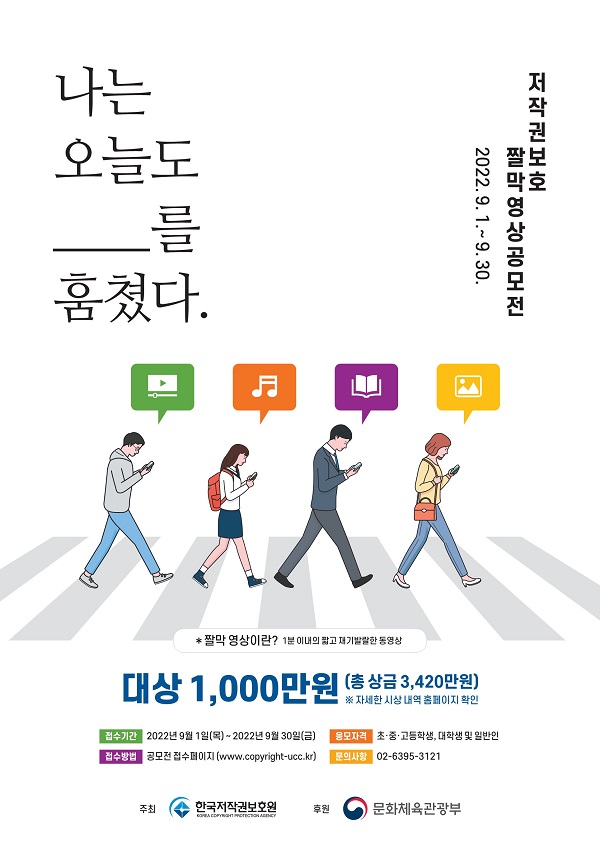 - 예술과 디지털 기술 등을 자유롭게 접목하되, 저작권 보호 또는 침해 예방을 주제로 한 영상 스토리텔링 콘텐츠 (브이로그, 애니메이션, 광고, 다큐 등 장르 자유) - 해상도 : 1280*720px 이상 *가로 또는 세로(숏폼) 영상 - 용량 : 300MB 이내 - 파일형식 : wmv, mp4, avi - 영상길이 : 60초 이내 ※ 수상작은 추후 원본 파일 제출 ※ 추후 수상작은 활용을 위해 재가공을 요청할 수 있음 |