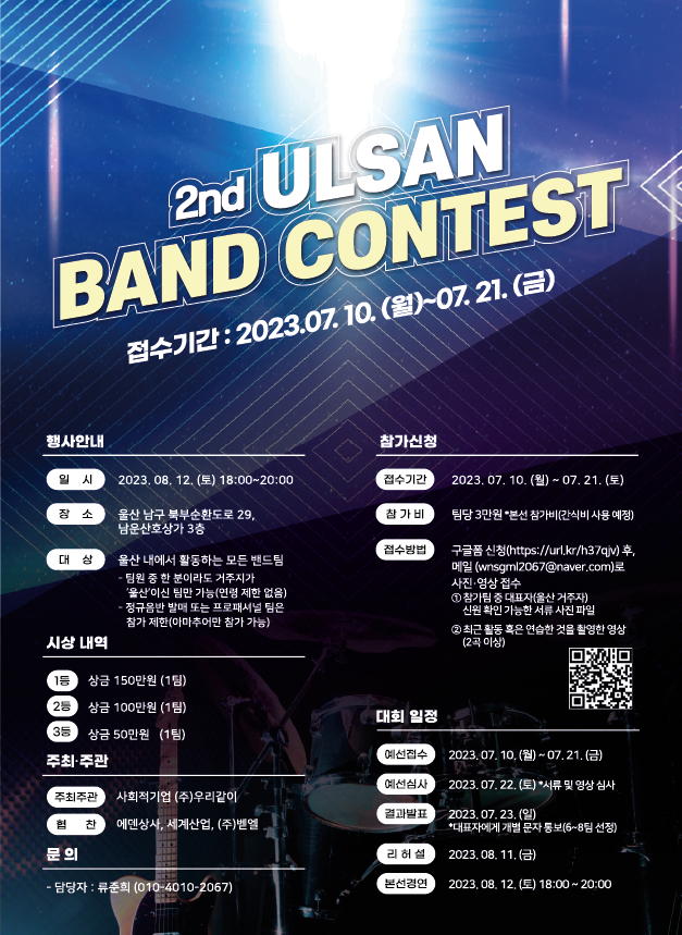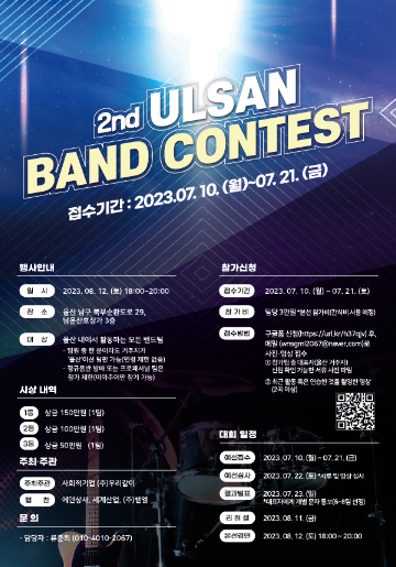 울산에 거주하고 계시는 모든 연령의 밴드팀의 경연 대회인 『2nd Ulsan Band Contest』를 아래와 같이 개최하고자 하오니 많은 관심과 참여를 바랍니다.