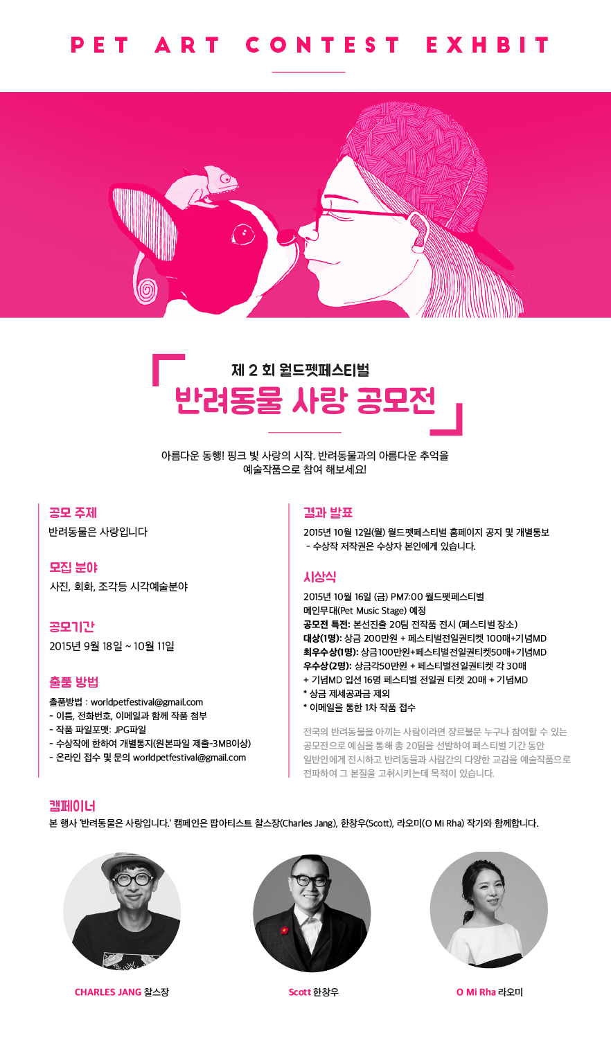 ▶ 출품방법 - 이메일 제출worldpetfestival@gmail.com- 이름, 전화번호, 이메일과 함께 작품 첨부- 작품 파일포맷: JPG파일