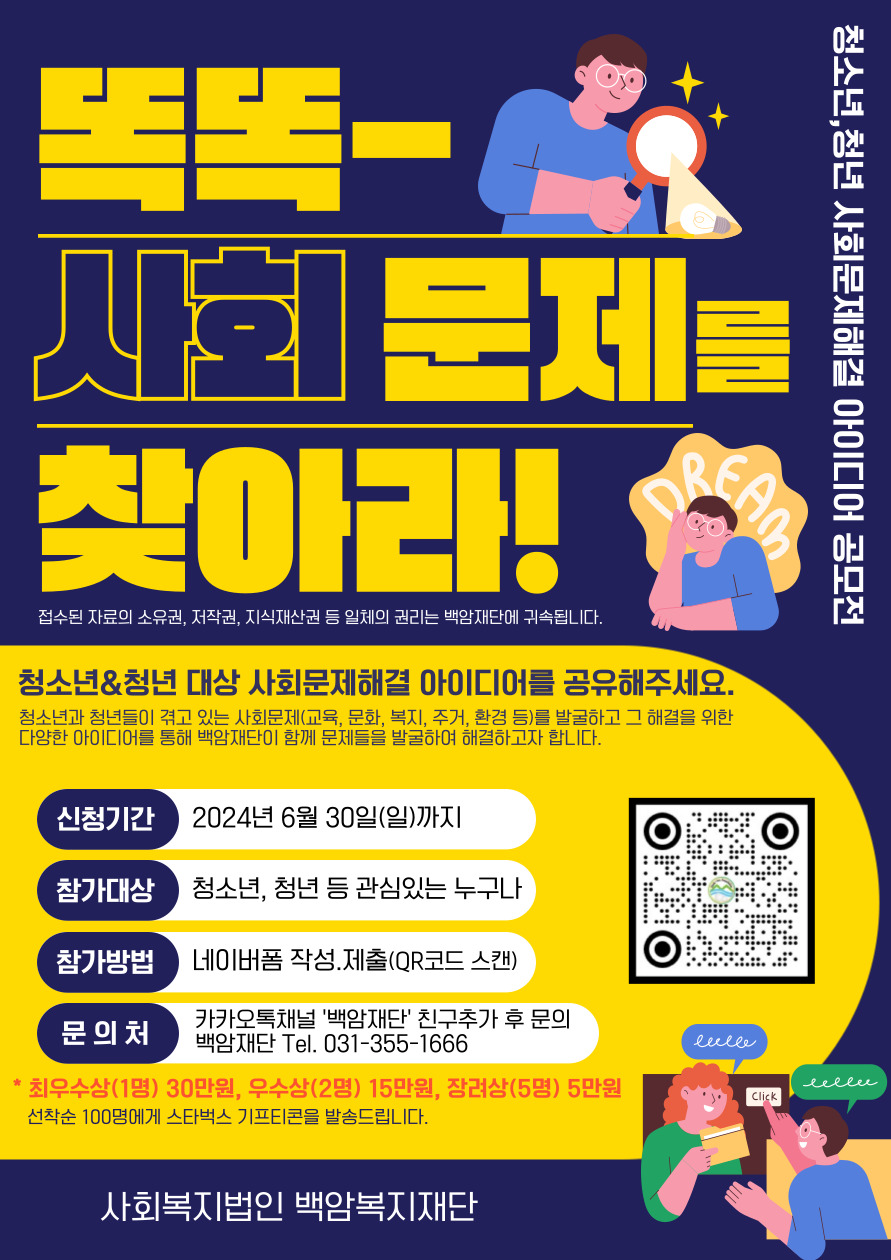 - 청소년과 청년들이 겪고 있는 사회문제(교육, 문화, 복지, 주거, 환경 등)를 발굴하고 그 해결을 위한 다양한 아이디어를 통해 백암재단이 함께 문제들을 발굴하여 해결하고자 합니다.
