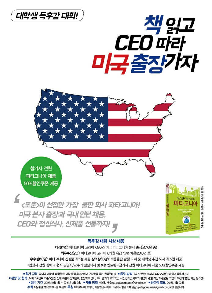 - 참가자 전원 : 파타고니아 제품 50% 할인쿠폰 제공. (참가자격과 독후감 표절 여부 등을 파악하여 2주에 1회 쿠폰 제공)