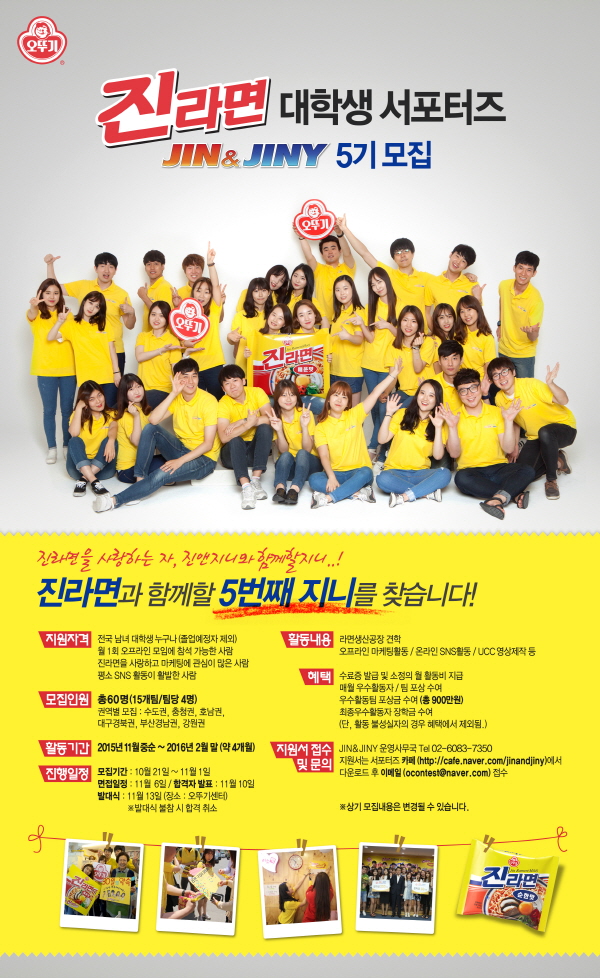 - 오뚜기 진라면 서포터즈 JIN&JINY 운영사무국 02-6083-7350 지원서는 서포터즈 카페(http://cafe.naver.com/jinandjiny)에서 다운 후 메일(ocontest@naver.com) 접수