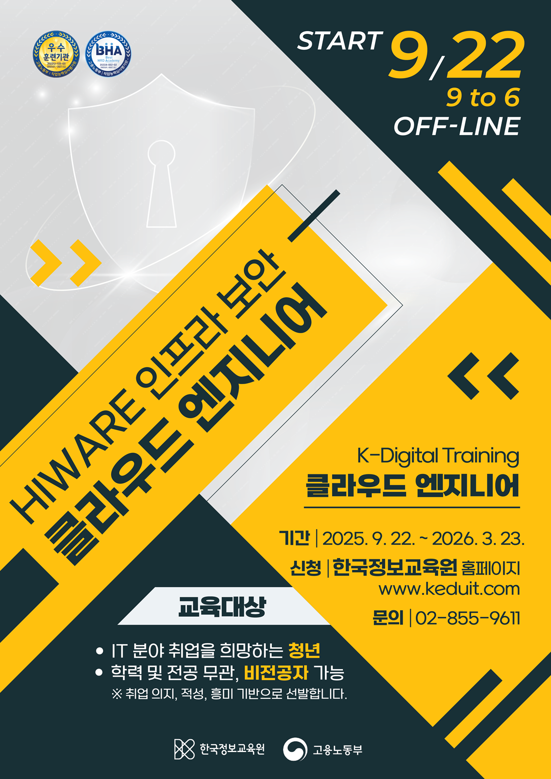 - 한국정보교육원은 2021년 고용노동부 선정 베스트직업훈련기관으로서 클라우드 등 4차산업혁명 IT 분야 전문 교육훈련기관입니다.