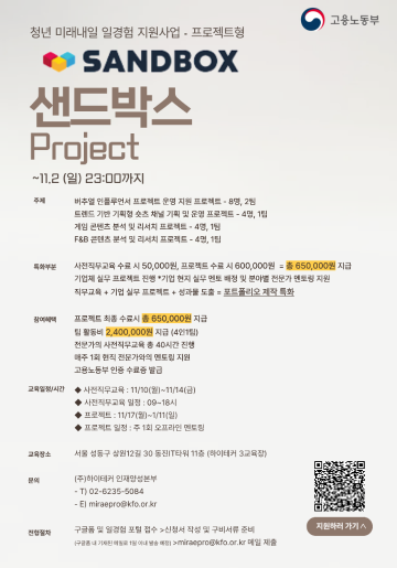 - 샌드박스 프로젝트 : 팀별 주제가 사전에 정해져 있으며, 관심 있는 주제를 선택해 실무 프로젝트를 수행