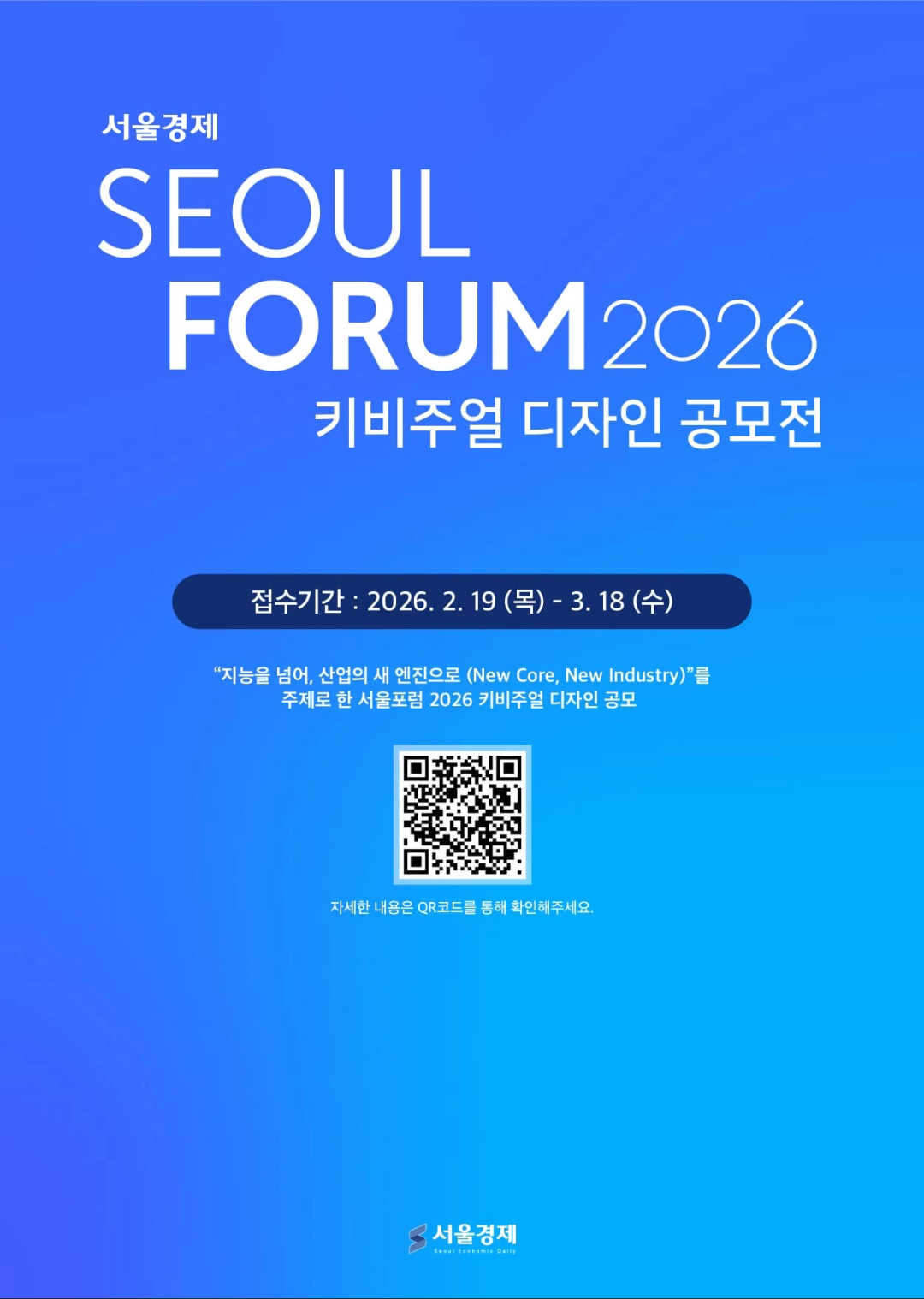 서울경제 주관으로 개최하는 서울포럼 2026 키비주얼 디자인 공모전은 AI가 산업과 사회의 중심 동력으로 이동하는 전환의 흐름을 배경으로 「지능을 넘어, 산업의 새 엔진으로(New Core, New Industry)」라는 서울포럼 2026의 주제(가제)를 명확하고 인상적인 시각 언어로 구현할 키비주얼을 모집합니다.