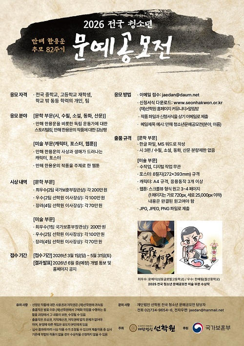 - 선정된 작품에 대한 사용권과 저작권은 (재)선학원에 귀속됨