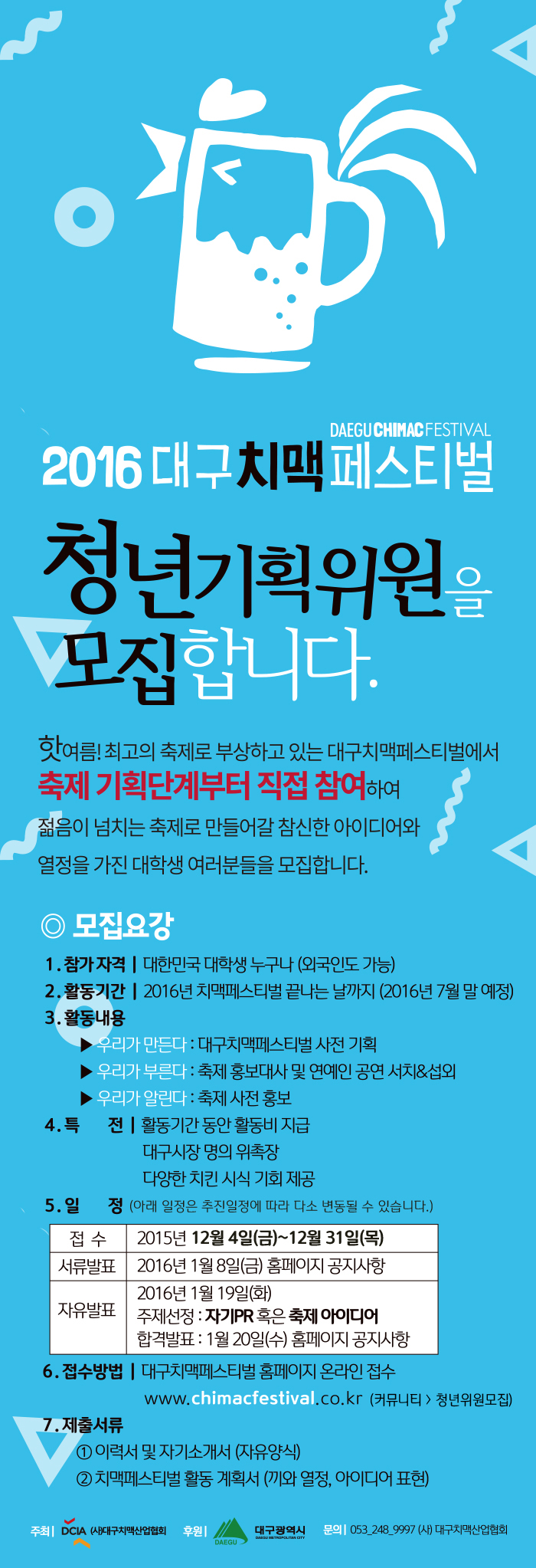 - 대구치맥페스티벌 홈페이지 온라인 접수 www.chimacfestival.co.kr (커뮤니티 > 청년위원모집)