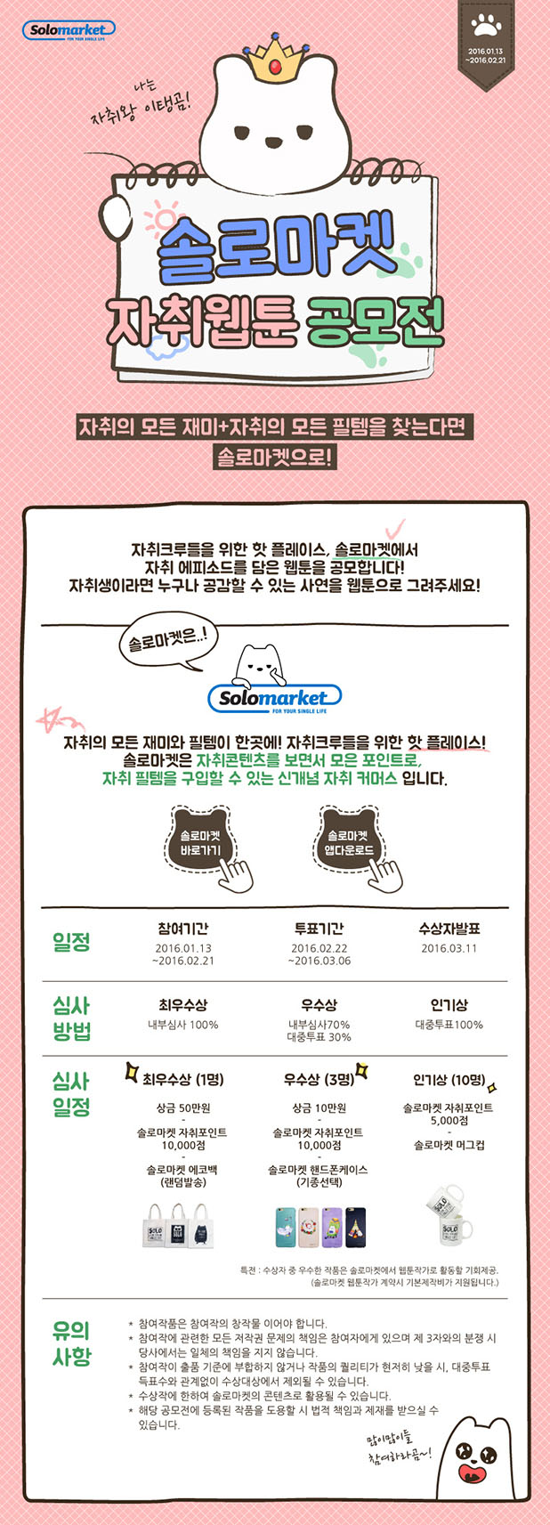 - 우수상(3명) : 상금 10만원+ 솔로마켓 자취포인트10,000점+솔로마켓 핸드폰케이스(기종선택)