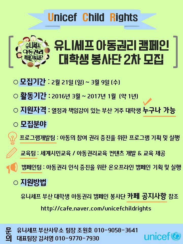 - 유니세프 부산 대학생 아동권리 캠페인 봉사단 팀장 김서영 010-9770-7930