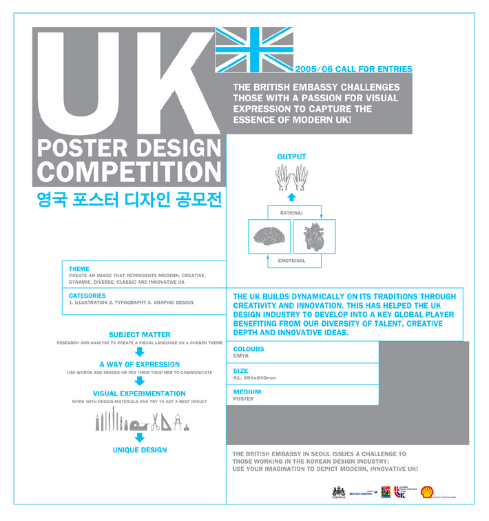 UK Poster Design Competition (영국 포스터 디자인 공모전) 주한영국대사관은 영국항공,영국관광청,영국상공회의소와 Shell Pacific Enterprises Ltd, 한국디자인진흥원,주한영국문화원의 후원으로 영국 포스터 디자인공모전을 다음과 같이 실시합니다. 1. 일 정 사전접수: 2005년 12월 5일~ 2006년 1월 31일(공모자들은 필히 12월 5일부터 사전등록 후 등록번호를 부여 받아야 함) *홈페이지 참조 작품제출 : 2006년 1월 16일~2월 10일 2. 발표 2006년 3월 6일 (월) 주한영국대사관 웹사이트 www.uk.or.kr에 공지 3. 부 문 (1) 일러스트레이션 (2) 타이포그래픽 (3) 그래픽디자인 ※ 시상작품은 부문별 시상이 아닌, 우수작품순으로 선발합니다. 4. 공모대상 만 18세 이상 대한민국 국민 (팀 구성시 2인 이하) 5. 공모주제 기존의 영국이 가진 전통적인 이미지에서 탈피하여 다음의 단어로 연상되는 영국의 이미지를 표현해 주십시요. Modern, Creative, Dynamic, Diverse, Classic and Innovative ※ 이번 공모전은 출품작들을 통해 영국의 다양하고 새로운 이미지를 부각시키고자 하는데 그 목적이 있습니다. 수상작들은 영국대사관과 후원기관들의 영국과 관련된 여러 이벤트 및 프로젝트에서 홍보용으로 사용되며 온라인과 오프라인 전시도 예정되어 있습니다. 6. 공모방법 (1) 사전등록 공식 영국 정보 사이트 www.uk.or.kr 에서 사전등록후 등록번호를 부여받는다. (등록번호를 부여받으면, 응모원서를 다운받을 수 있습니다) 사전등록은 홈페이지에서. (2) 공모 양식을 지켜 우편으로 접수하셔야 합니다. 접수 주소 : 서울 중구 정동 4번지 영국대사관 공보과 (포스터 디자인 공모전 작품 재중 명시) 문의 : (02) 3210- 5564/5565 (ppa@uk.or.kr) (3) 공모양식 접수시 ◆ 작품파일이 저장된 CD-ROM (등록번호 기입) ◆ A1 사이즈: 594 x 840mm의 응모작 칼라 출력물 (뒷면에 등록번호 기입) ◆ 응모원서 를 같이 보내셔야 합니다. ※ 작품파일은 Adobe illustrator(ai 형식), Photoshop (psd 형식), Quark (Quark 문서, 글꼴 및 이미지 소스 포함) 중 하나로 작업한 300 dpi 이상의 CMYK 칼러의 파일로 사이즈는 제한 없음. ※ CD-ROM은 윈도우에서 읽기 가능한 형식(ISO9660)으로 제작되어야 함. 7. 시상내역 대상: 영국 왕복 항공권 + 숙박권 (4 star hotel) 영국항공/영국관광청 상: 영국 왕복 항공권 + 숙박권 (3 star hotel) 영국상공회의소 상: 100만원 상당 애플 컴퓨터 상품권 Shell 상: 100만원 상당 애플 컴퓨터 상품권 *모든 수상자에게는 주한영국대사의 공식상장이 함께 수여됩니다 8. 심사기준 공모주제를 잘 표현하였는가? 독창적이고 창의적인 작품인가? 홍보용으로 적합한가? ※ 심사 제외 대상 타 공모전에 제출되었거나 이미 수상한 경력이 있는 공모작 이미 사용되고 있거나 혹은 앞으로 사용 예정이 있는 공모작 타인의 저작권을 침해한 공모작 기타 공모전의 제반 규정과 조건을 준수하지 않은 작품 심사 제외 대상 요건의 사실을 숨기고 공모할 경우, 모든 법적 책임은 공모자에 있음. 9. 저작권 공모전 입상작에 대한 저작권은 영국대사관이 소유합니다. 저작권에는 복제권, 임의 변경권, 광고/홍보 사용권 등 영국대사관과 후원 업체의 홍보 및 기타 활동에 소요되는 모든 권리를 포함합니다. 입상되지 않은 작품에 대한 저작권은 출품자에게 귀속됩니다. 본사가 입상되지 않은 작품을 홍보 목적 등을 위하여 공중에게 공표할 필요가 있을 경우엔 사전에 문서 또는 이에 준하는 방법으로 출품자의 승낙을 받아야 합니다. 10. 작품의 반환 심사를 위해 접수된 문서와 파일, 저장매체 등은 일체 반환되지 않습니다. 접수된 작품 및 응모자의 개인 신상에 관한 정보는 공모전 이외의 다른 어떤 용도로도 쓰이지 않으며 외부에 누출하지 않습니다. 주최 : 주한영국대사관 후원 : 영국항공, 주한영국관광청, 주한영국상공회의소, Shell Pacific Enterprises Ltd., 한국디자인진흥원,주한영국문화원