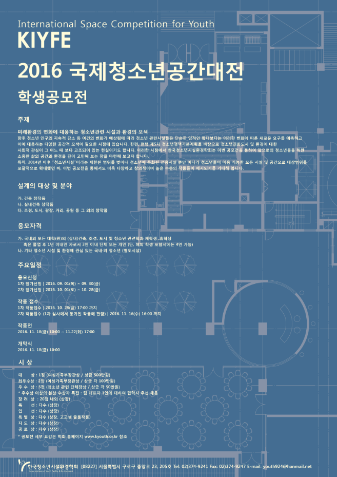 - 본 학회 홈페이지(www.kyouth.or.kr) -> 공모전안내 -> 2016 국제청소년공간대전 출품요강(첨부파일)