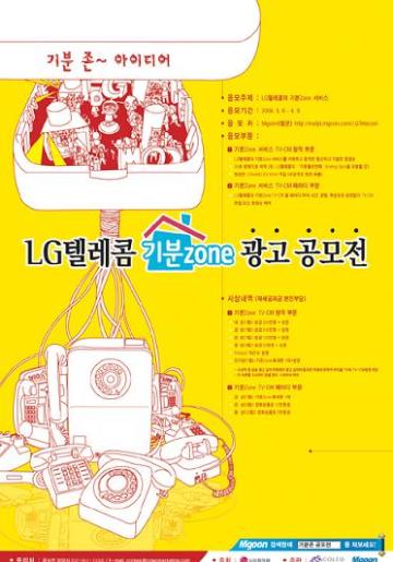 ■ 응모주제: LG텔레콤의 기분Zone 서비스 ■ 응모기간: 2006. 5. 8 ~ 6.9 ■ 응 모 처: Mgoon(엠군) http://www.mgoon.com/ ■ 응모부문 1. 기분Zone TV-CM 창작 부문 - LG텔레콤의 기분Zone 서비스를 이해하고 창작한 참신하고 기발한 동영상 - 30초 분량으로 제작 (단, LG텔레콤의 ‘기분좋은변화’ Ending Spot을 포함할 것) - 원본은 720×480 DV 6㎜ 작업 (수상작은 원본 제출) 2. 기분Zone TV-CM 패러디 부문 - LG텔레콤의 기분Zone TV-CM을 패러디 하여 시간, 용량, 해상도와 상관없이 TV- CM 편집 또는 동영상 제작 ■ 시상내역 (제세공과금 본인부담) 1. 기분Zone TV-CM 창작 부문 대 상(1팀): 상금 300만원+상장 금 상(1팀): 상금 200만원+상장 은 상(1팀): 상금 100만원+상장 동 상(3팀): 상금 50만원+상장 Finalist: 약간수, 상장 인기상(1팀): 기분Zone 휴대폰 1대+상장 ※ 수상작 중 방송 광고 심의 위원회의 광고 심의에 통과한 작품에 한하여 케이블 TV에 TV-CM방영 예정 ※ 단 부문별 수상작이 없을 경우, 시상에서 제외 2. 기분Zone TV-CM 패러디 부문 금 상(1팀): 기분ZONE 휴대폰 1대 은 상(5팀): 문화상품권(10만원권) 동 상(10팀): 문화상품권(3만원권) ■ 문 의 처: 공모전 담당자 (02-561-1030) E-mail: contest@coleomarketing.com ■ 주 최: LG텔레콤 ■ 후 원: 콜레오마케팅그룹, Mgoon(엠군) ※ 공모전에 대한 자세한 내용은 Mgoon(엠군)에서 확인하세요!
