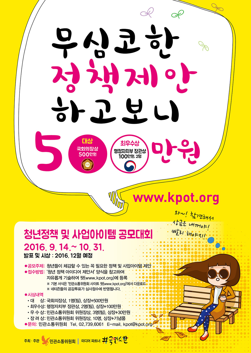 - ‘청년 정책 아이디어 제안서’양식을 참고하여 자유롭게 기술하여 팟(www.kpot.org)에 등록