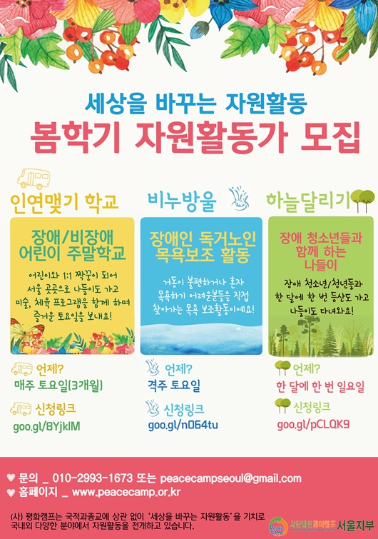 - SNS(페이스북, 트위터, 인스타그램 등): https://www.facebook.com/peacecamp.or.kr/