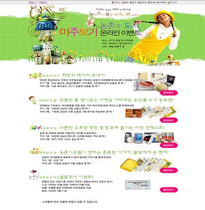 제 6회 농촌과 도시, 마주보기 온라인 이벤트 -농산물 수기 공모전- 우리 먹거리에 관련된 재미있는 에피소드, 우수성 등을 잘 표현한 여러분의 글을 기다리고 있습니다. 여러분의 작은 관심이 오늘도 땀흘려 일하는 농업인 여러분들에게는 큰 힘으로 다가갑니다. 많은 참여와 관심 부탁드립니다. 기간: 08.01~08.31 발표: 09.08 상품: 우수1 명- 20만원 상당의 각종 상품권 중 택 1 가작 2명- 10만원 상당의 각종 상품권, 제수용 과일 5종 세트 중 택 1 참여하기: http://www.affis.net/portal/publish_html/event2006/