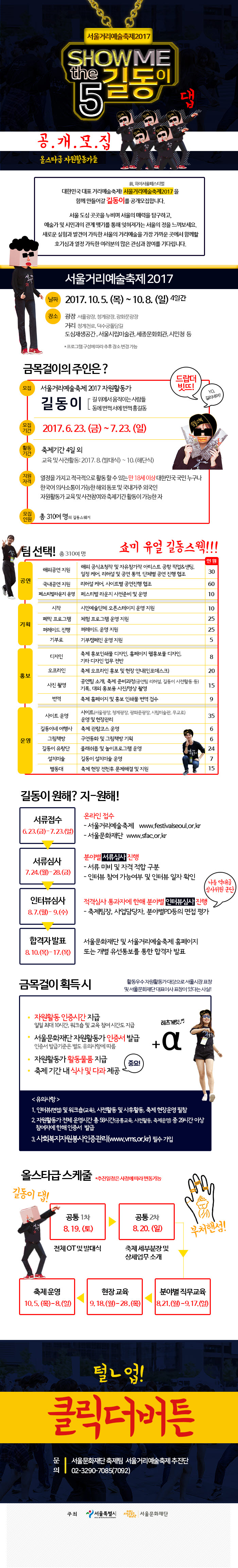 - 모집부문 : 서울거리예술축제2017 자원활동가 ‘길동이’ (※길동이는 ‘길 위에서 움직이는 사람들’이라는 뜻으로 홍길동처럼 동에 번쩍, 서에 번쩍 출몰하여 축제세상을 만들어가는 서울거리예술축제 자원활동가의 애칭입니다.)