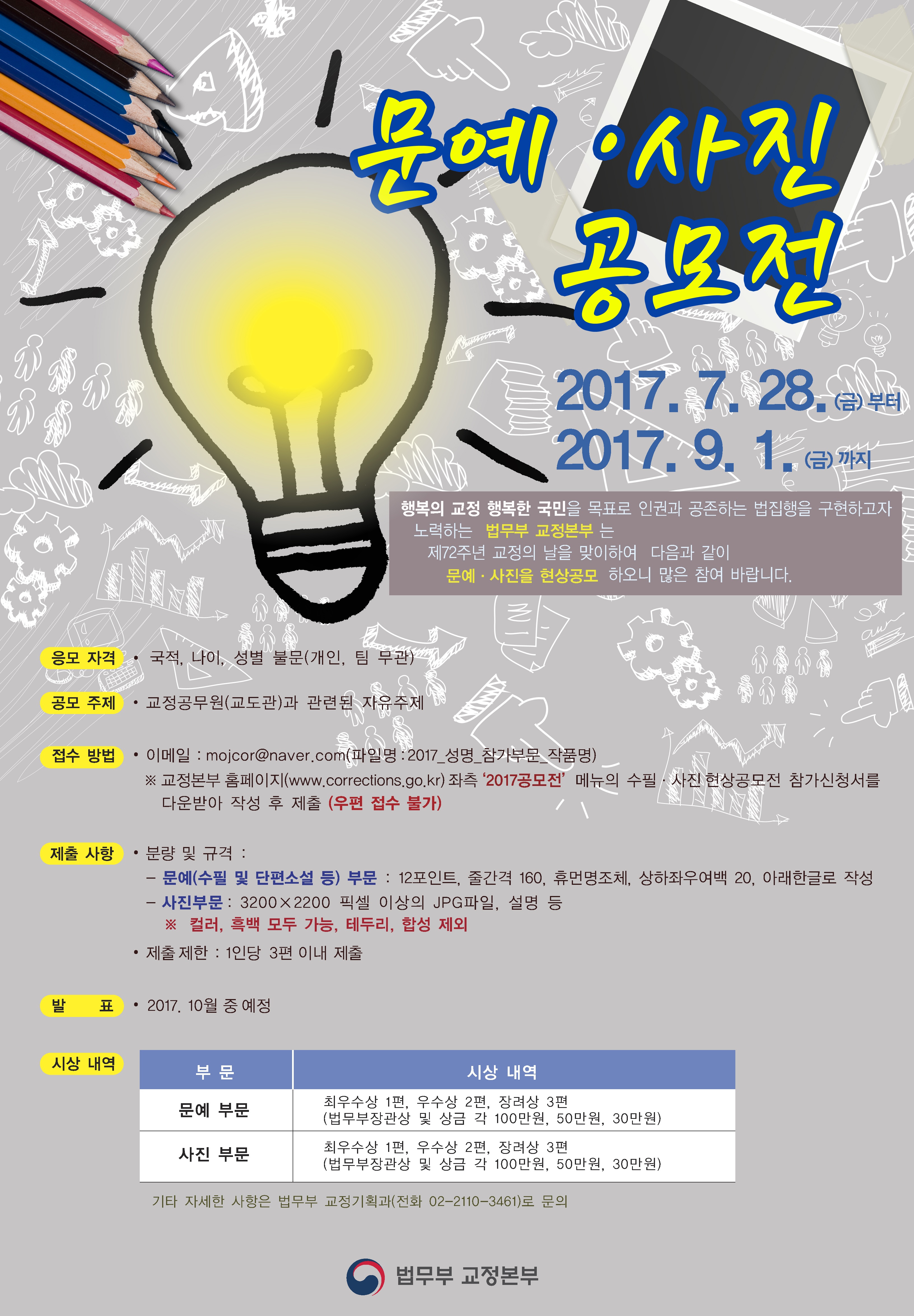 행복한 교정 행복한 국민을 목표로 인권과 공존하는 법집행을 구현하고자 노력하는 법무부 교정본부는 제72주년 교정의 날을 맞이하여 아래와 같이 문예․ 사진 작품을 현상공모하오니 많은 참여바랍니다.