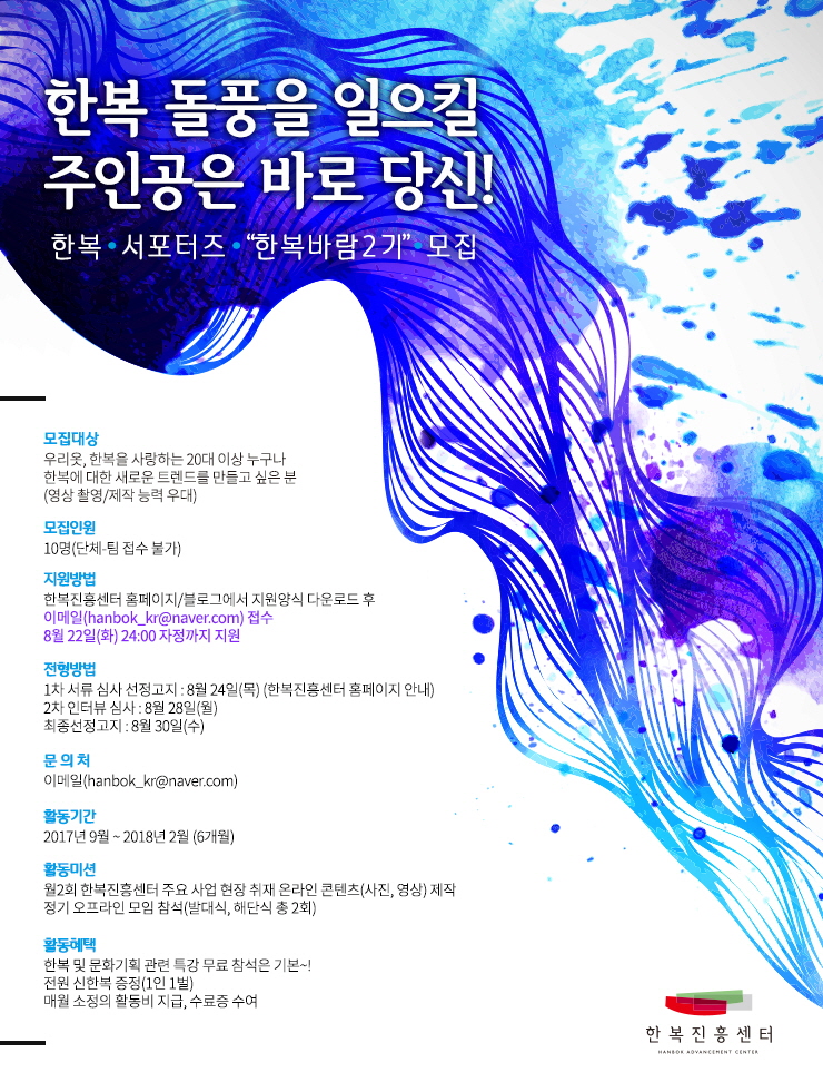 - 한복 돌풍을 일으킬 주인공은 바로 당신! 한복 서포터즈 "한복바람2기" 모집